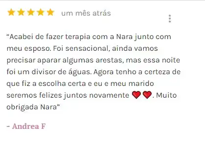 Você tem a flexibilidade de poder fazer terapia de qualquer lugar do Brasil e do Mundo, sem gastar tempo para se deslocar. As sessões são realizadas pelo Google Meet; você pode fazer pelo celular, tablet ou pelo notebook, só precisa ter acesso a internet. O casal pode fazer no mesmo ambiente ou até mesmo em telas separadas.