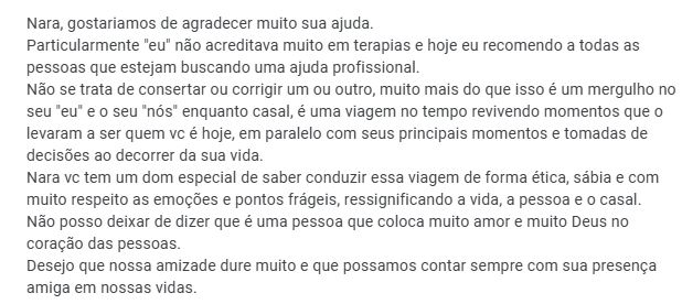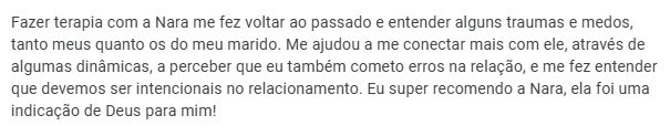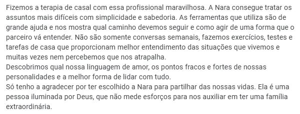 Olá, Meu nome é Nara Granado, Sou Terapeuta Especialista em Relacionamento de Casal. Minha missão é ajudar casais a lidarem com suas crises, dificuldades e diferenças, promovendo alinhamento, harmonia e bem estar, possibilitando que superem suas crises e sigam seu propósito de vida juntos com amor e respeito. Sou especialista em restauração de casamentos, mediação (casal e família), conciliação, superação, qualidade de convivência e resolução de conflitos.